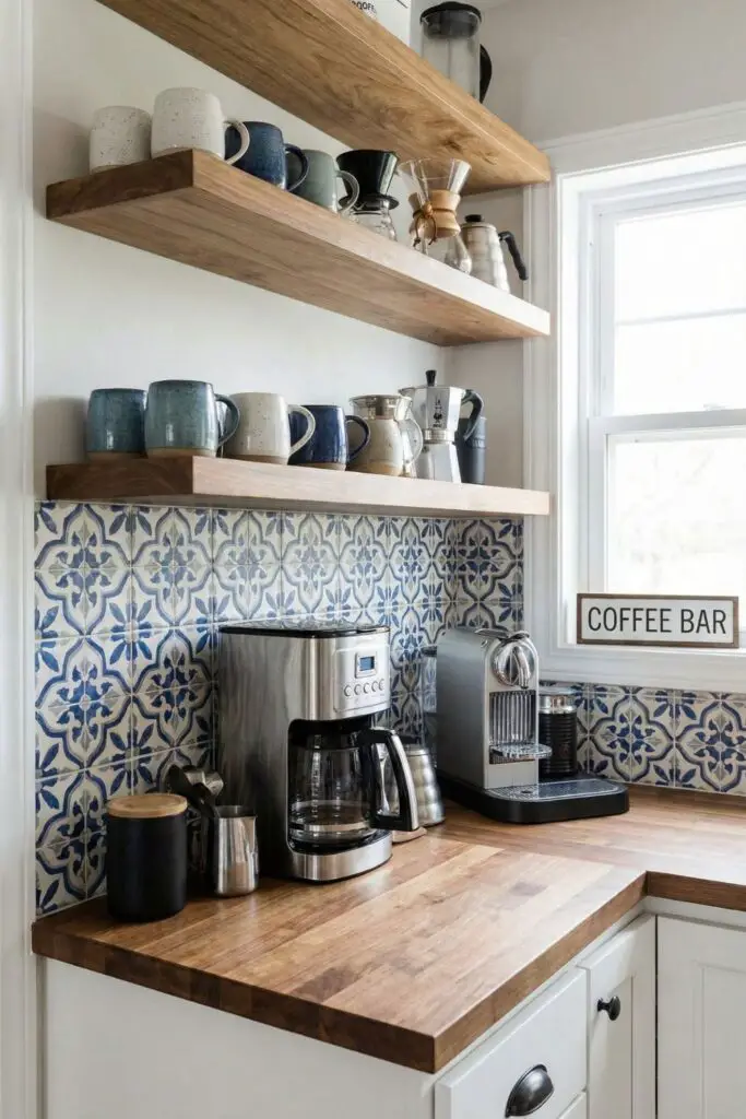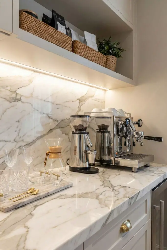 Let your backsplash be the statement piece that transforms your kitchen coffee bar into an eye-catching corner you’ll love to use daily.