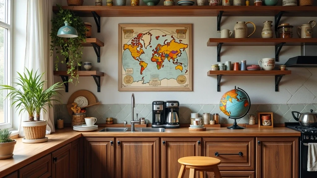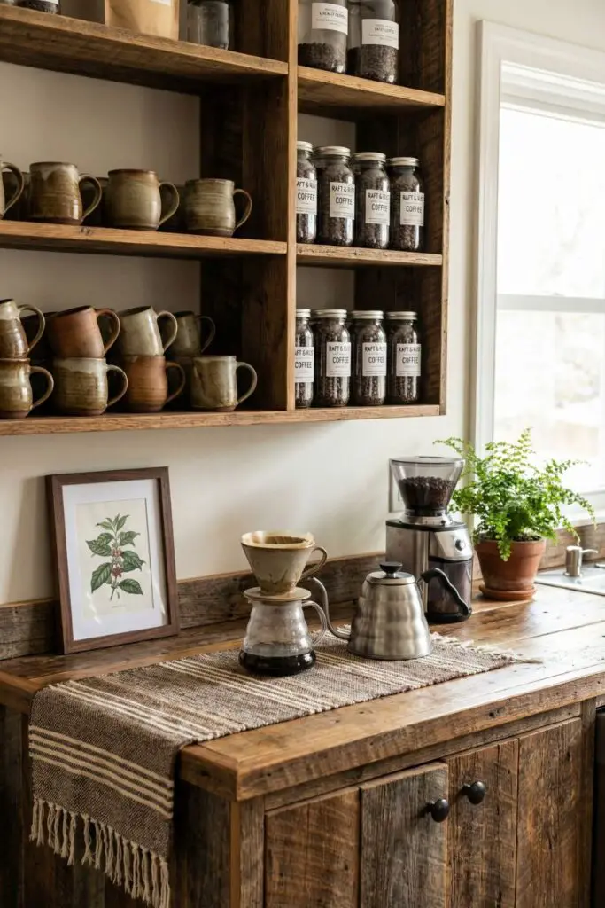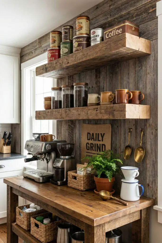 Pair with a sturdy coffee maker or even a vintage espresso machine for authentic charm. Consider using reclaimed wood for shelving and include woven baskets for easy storage.