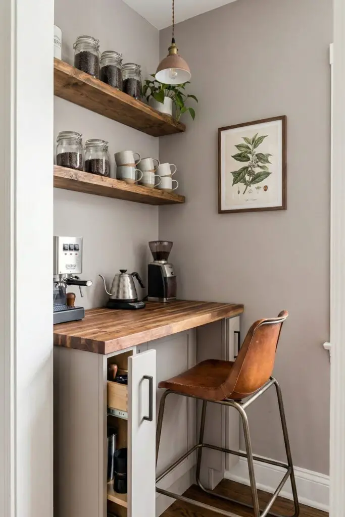 Don’t let a small kitchen stop you from a fantastic coffee bar idea. A compact coffee nook makes it easy to weave your coffee ritual into even the tiniest of countertops. Use floating shelves or slim cabinets to store beans, mugs, and accessories. Add a stylish stool for a cozy, coffee shop-like vibe, making your morning brew feel extra special.
