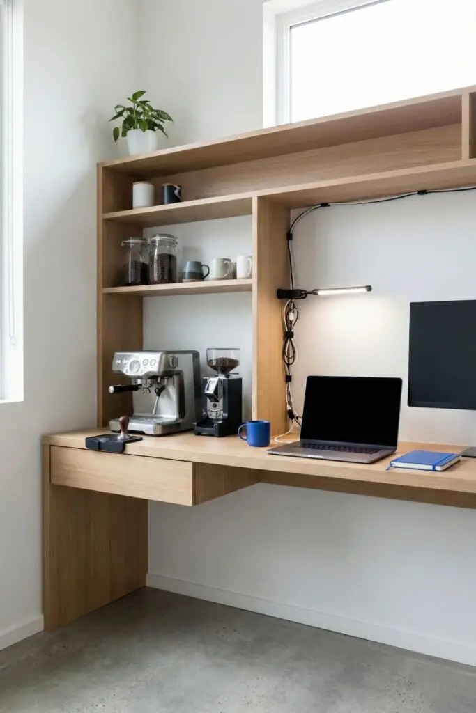 If you’re working from home, why not merge your kitchen coffee station with a functional workspace? A contemporary bar setup with a dedicated laptop nook, organized wires, and clip-on lights creates an efficient environment for productivity.