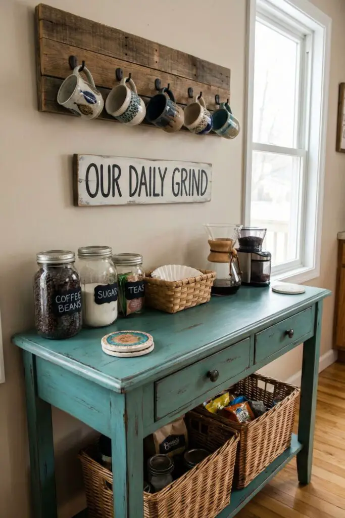 Storage canisters, hooks for mugs, and woven baskets for accessories boost functionality and organization. Not only does this option give your coffee station a one-of-a-kind look, but the handmade touches—like crafted coasters or painted mugs—reflect your own personality, making every cup feel special.