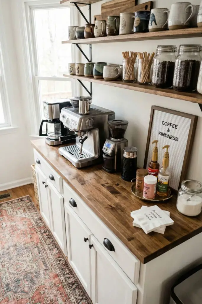 Finish off by decorating with your favorite mugs, a small plant, and maybe a chalkboard menu sign to personalize your kitchen coffee bar. This simple setup transforms your kitchen into a welcoming spot for your daily caffeine fix!