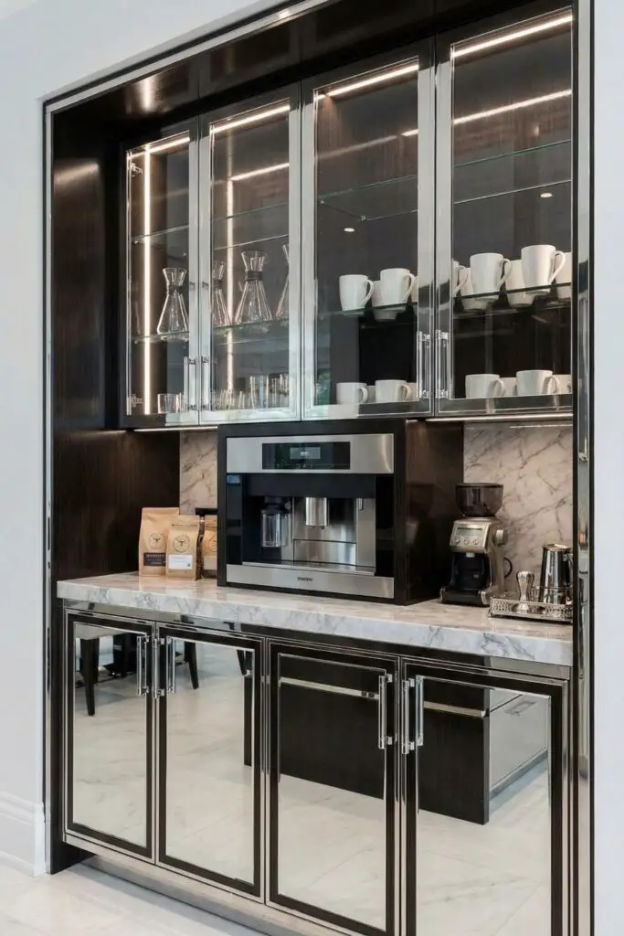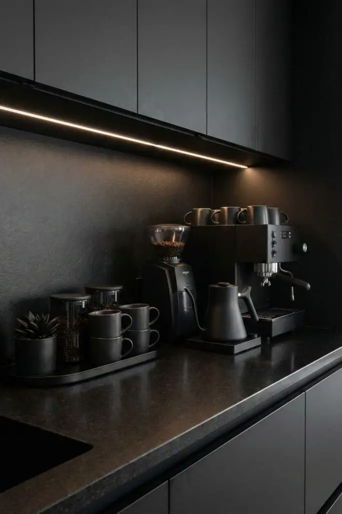 Dare to go bold with an all-black coffee bar, delivering drama and understated luxury. Smooth finishes, matte surfaces, and subtle lighting effects create a coffee station that exudes sophistication without being overwhelming.
