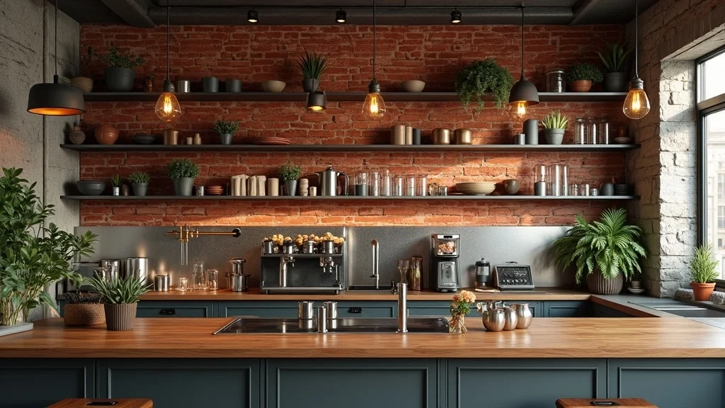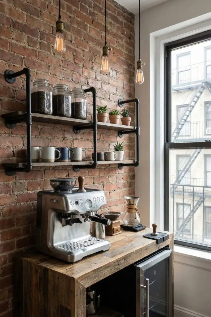 Transform your city dwelling with an urban loft coffee station. Raw brick walls, hanging metal shelves, and bold industrial lights evoke the edginess of an open-plan city kitchen. Use potted succulents and glass jars to soften the look, and choose a compact yet advanced coffee maker to conserve space.