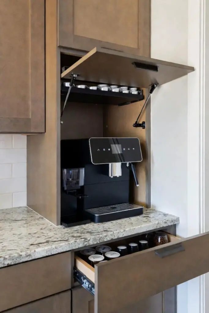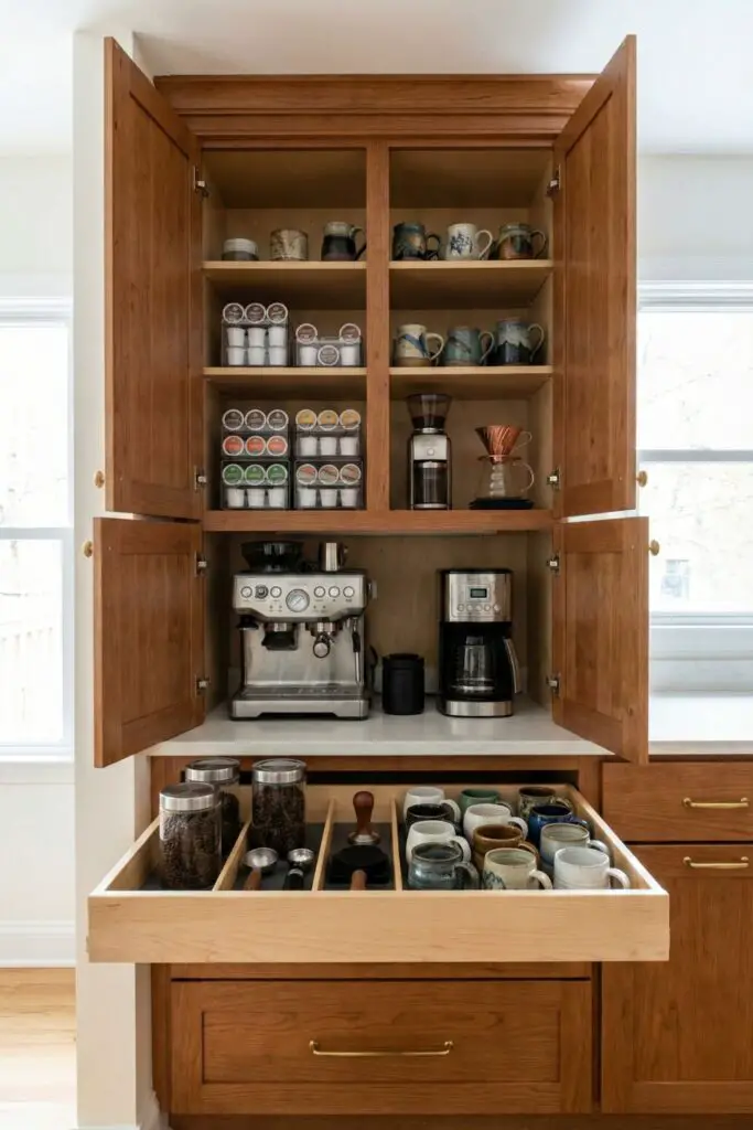 Try adding adjustable shelves to fit taller equipment like coffee makers or espresso machines. Pull-out drawers can keep canisters, favorite mugs, or coffee tools organized and out of sight.