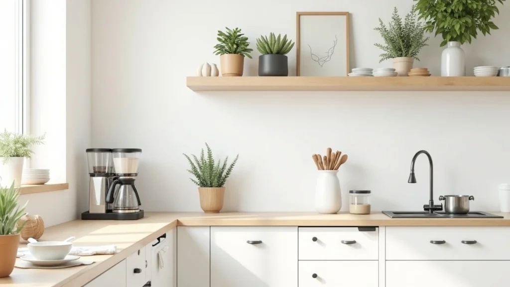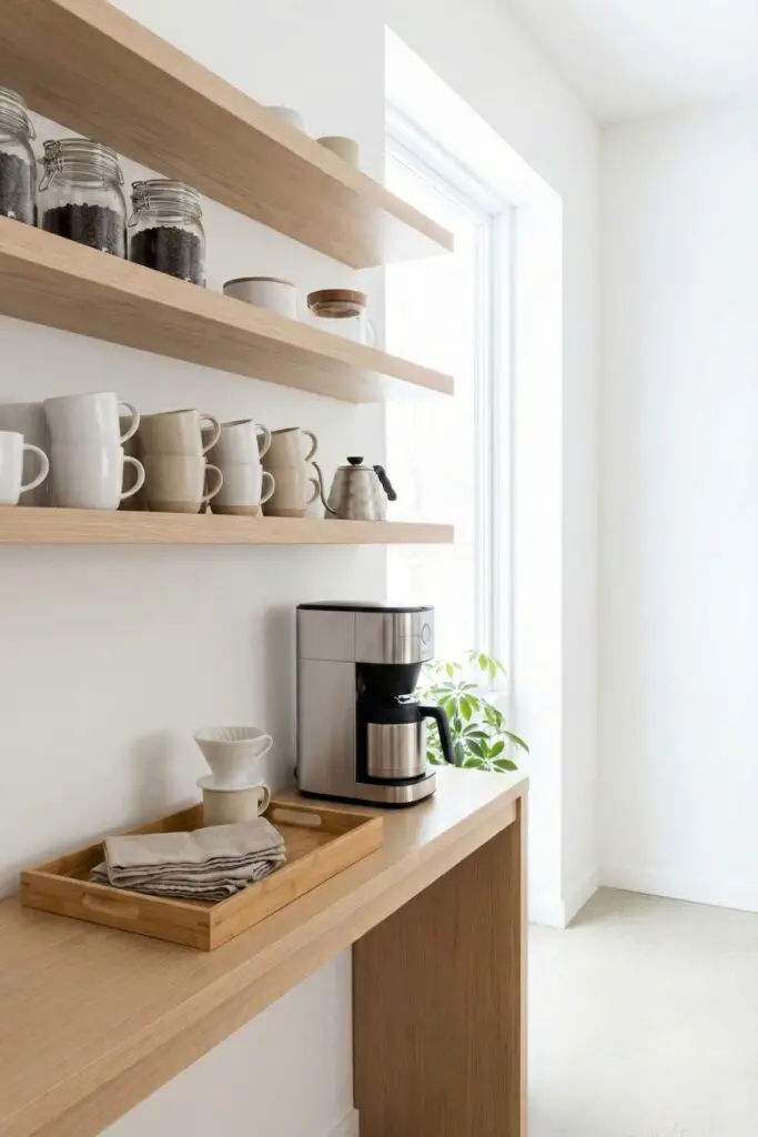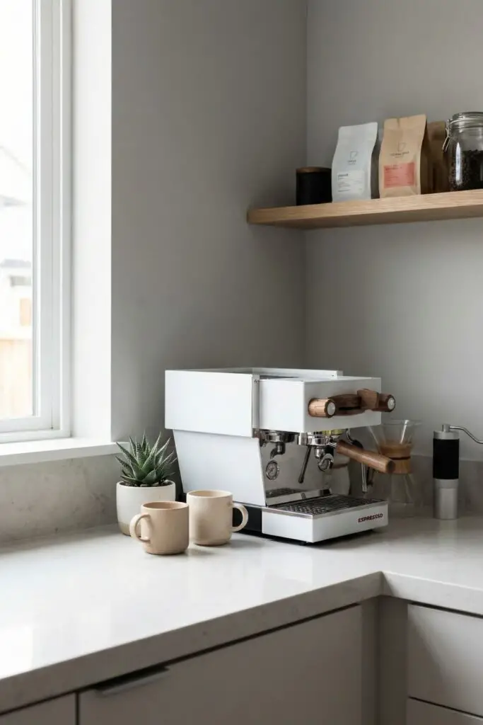 By limiting décor to a streamlined coffee machine, a couple of favorite mugs, and perhaps a small plant, clutter disappears and every morning feels more serene.