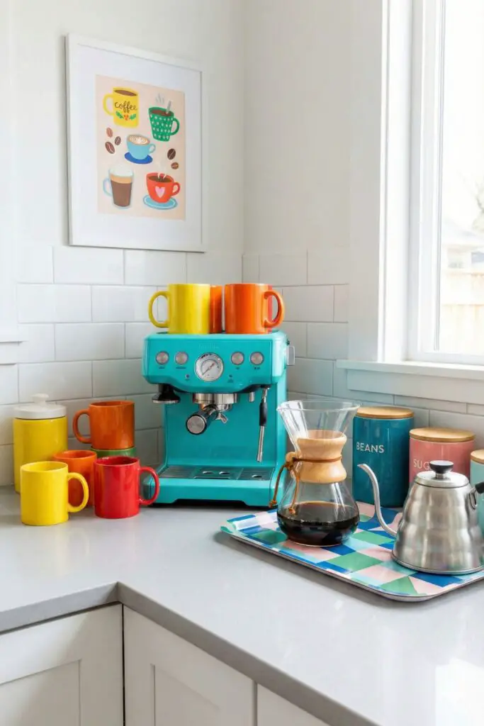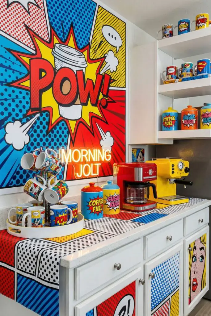 Turn your daily brew into a work of art with a pop art-inspired coffee bar. This style is all about bold colors, graphic prints, and playful touches a true conversation starter in any modern kitchen. Opt for mugs and canisters with comic-style designs, bright storage canisters, and fun wall art that make the coffee station as lively as your morning routine.