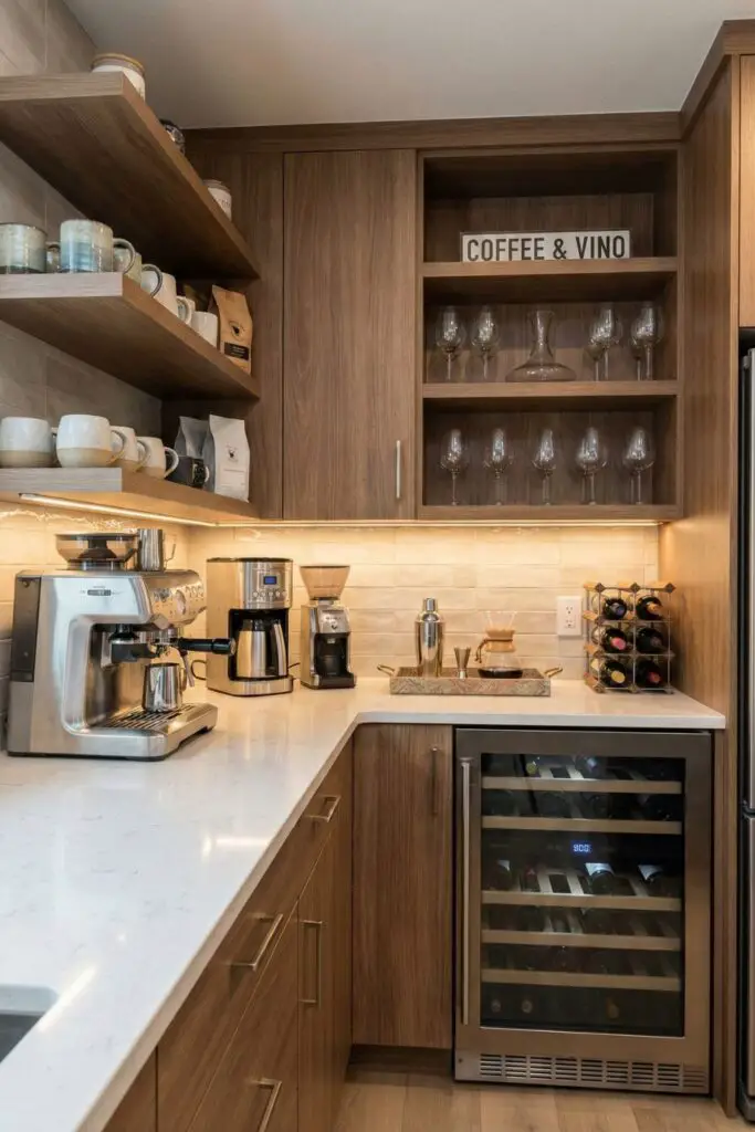 Why settle for just coffee when you can serve up wine, too? A multifunctional coffee and wine bar brings ultimate versatility to your kitchen counter. Dedicate one side to your favorite coffee maker and espresso machine, and the other to a compact wine rack and glasses. This setup is especially useful for kitchens where entertaining guests is a regular occasion.