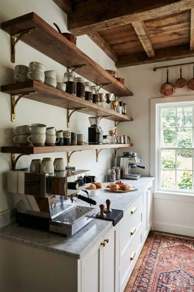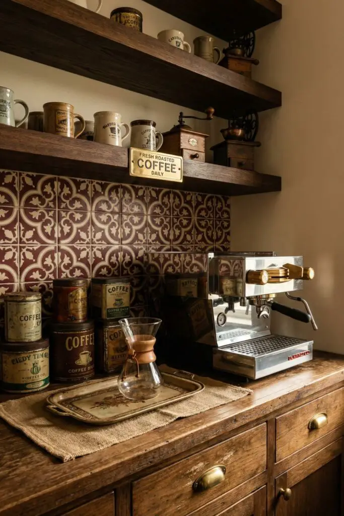 Add a touch of greenery and some antique décor pieces—like brass scoops or enamelware—to bring the space alive. This cozy bar idea encourages guests to linger while offering you practical kitchen organization for all your coffee essentials.