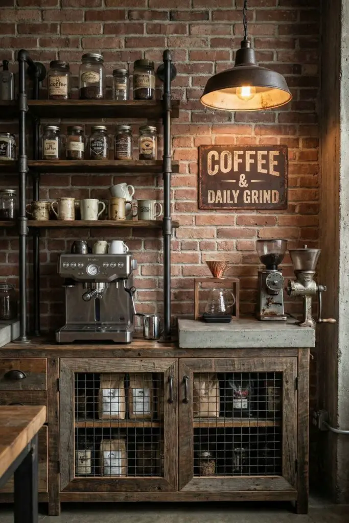 If you love the blend of past and present, a vintage industrial coffee bar combines the best of both. Exposed metal pipes as shelves, concrete countertop coffee station surfaces, and distressed finishes work together to create a raw, urban vibe.