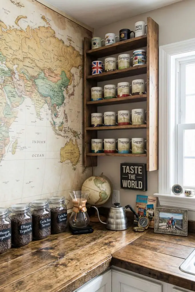 Bring your love of travel into your daily routine with a coffee bar that celebrates global inspiration. Decorate with a world map, display a collection of mugs from your favorite destinations, and offer a rotating selection of international coffee beans. Accent your counter with travel souvenirs or mini globes to emphasize your wanderlust.